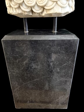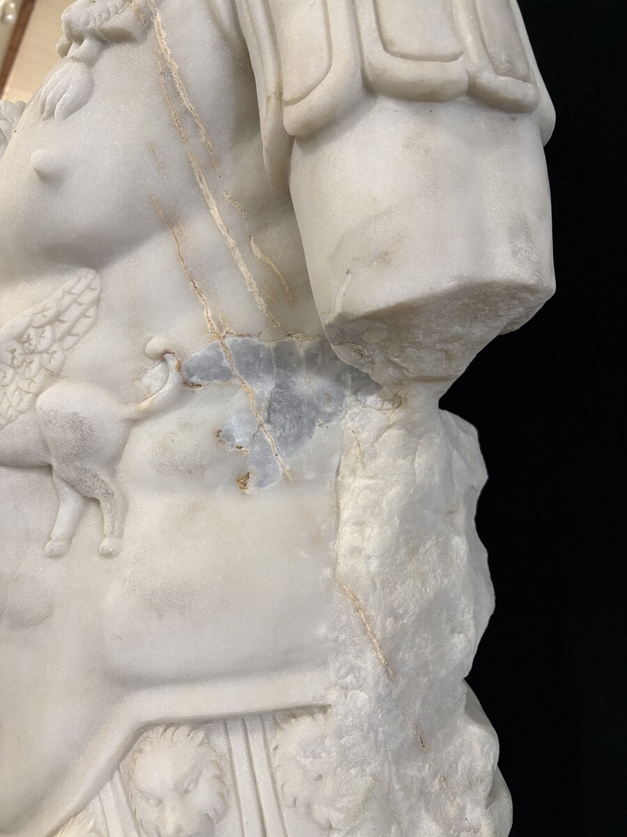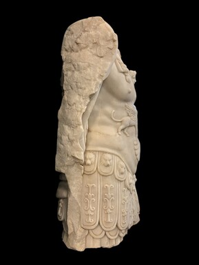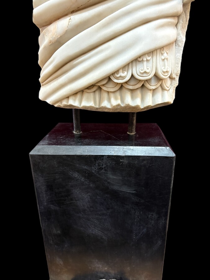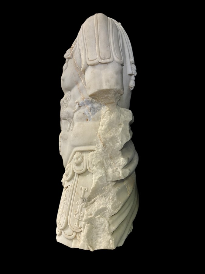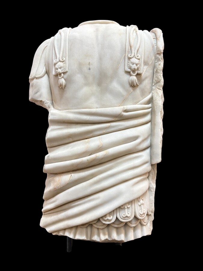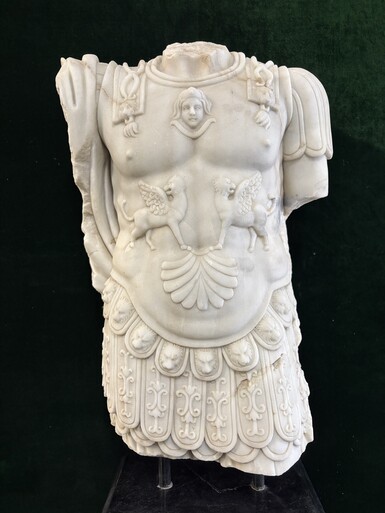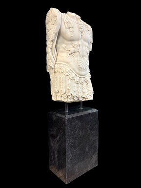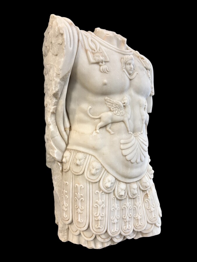 An impressive sculpture of a Roman torso in white marble, exuding the power and beauty of classical antiquity. The detailed breastplate is richly decorated with hand-carved mythological motifs.
