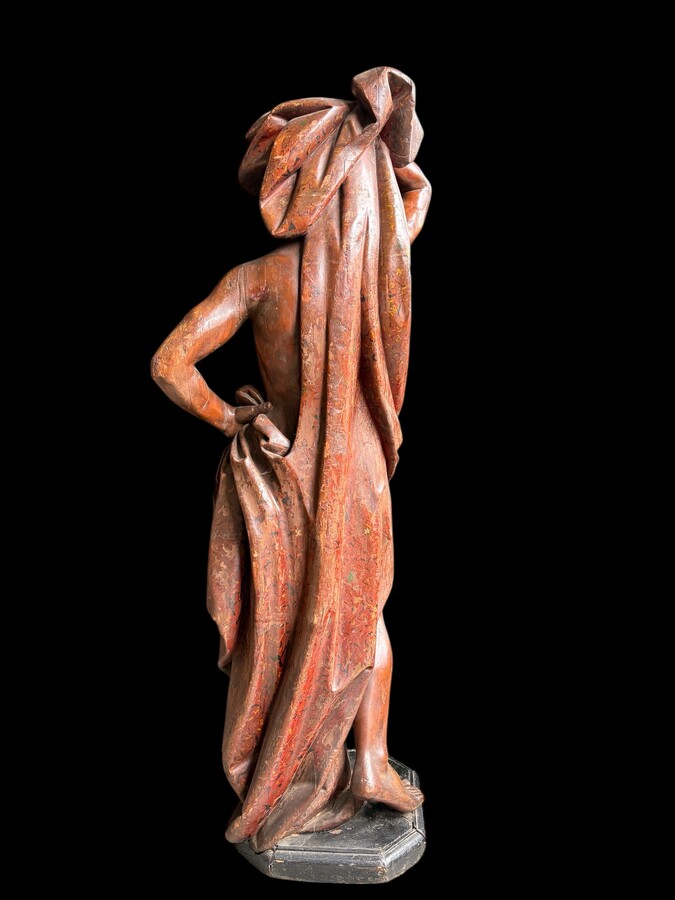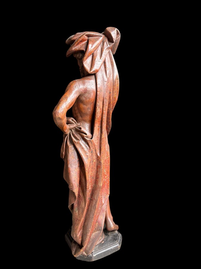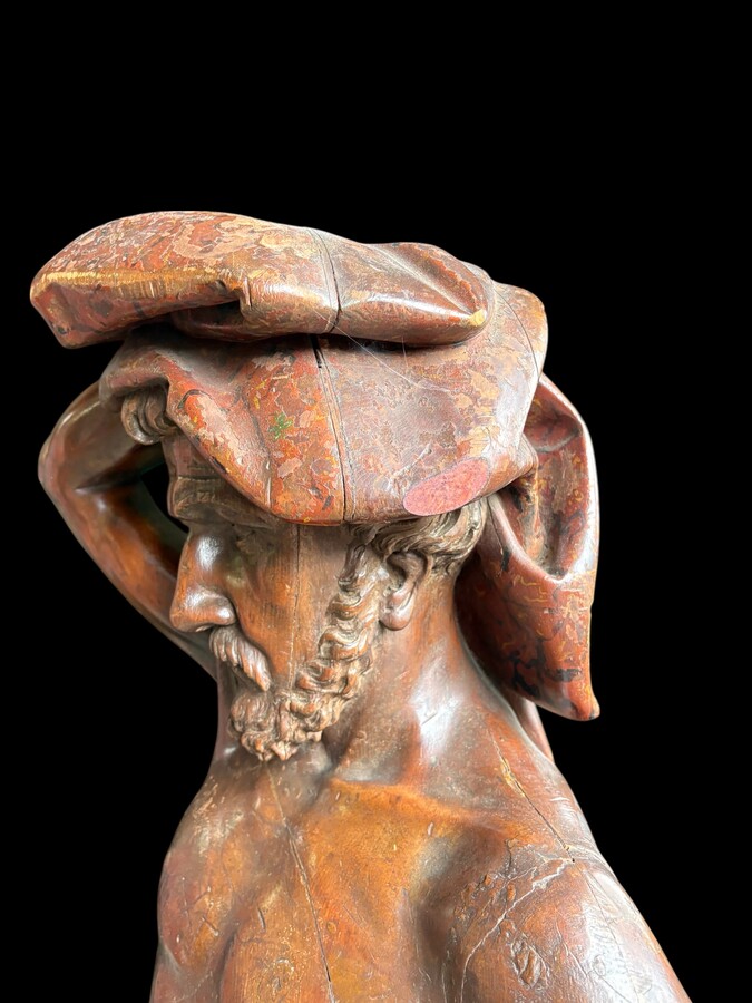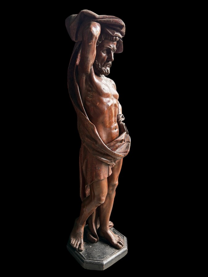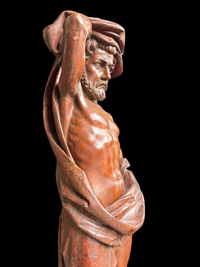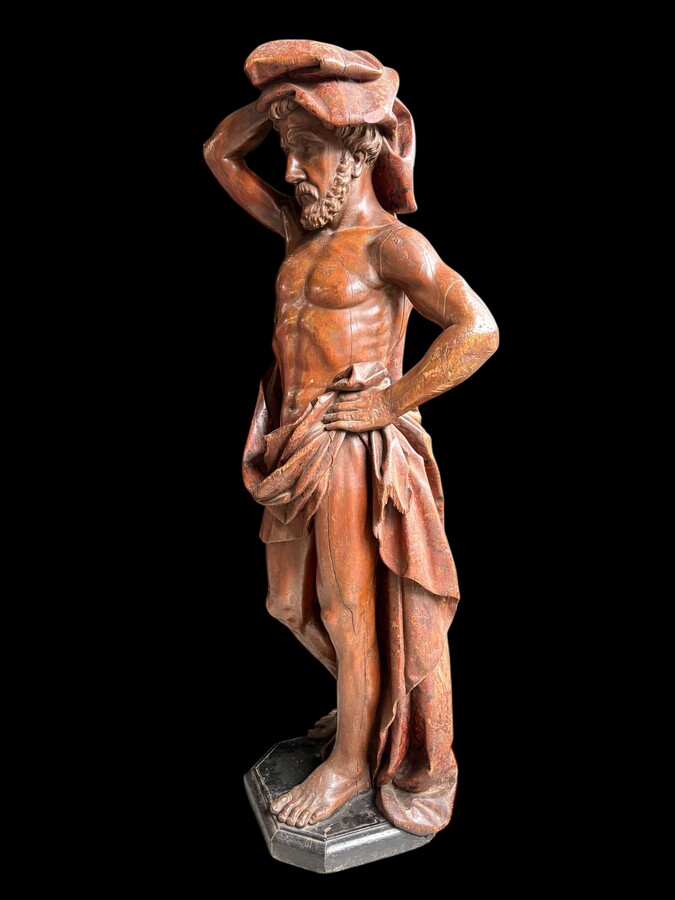 Large Italian painted wooden sculpture dating from around 1700 (157 cm). Highly decorative wooden sculpture depicting a man wrapped in cloth, which can also be used as a support. Dimensions: Height: 157 cm.
