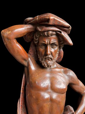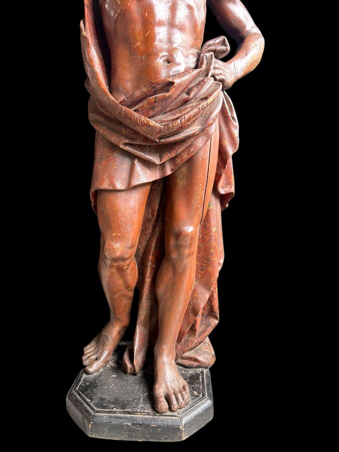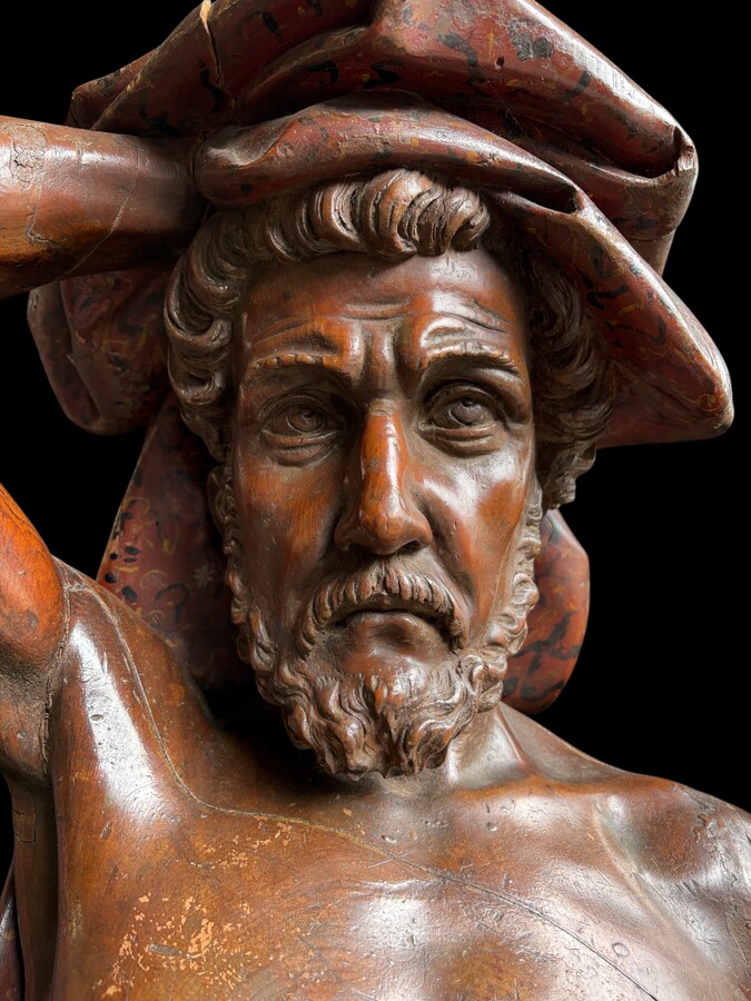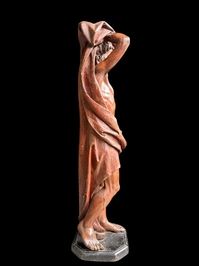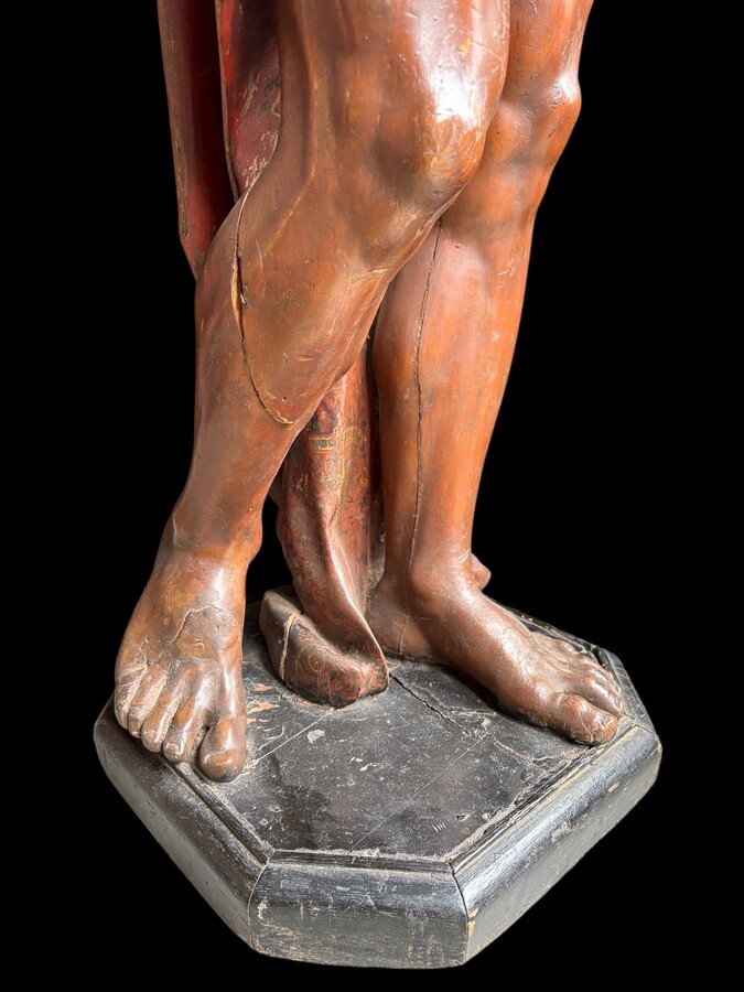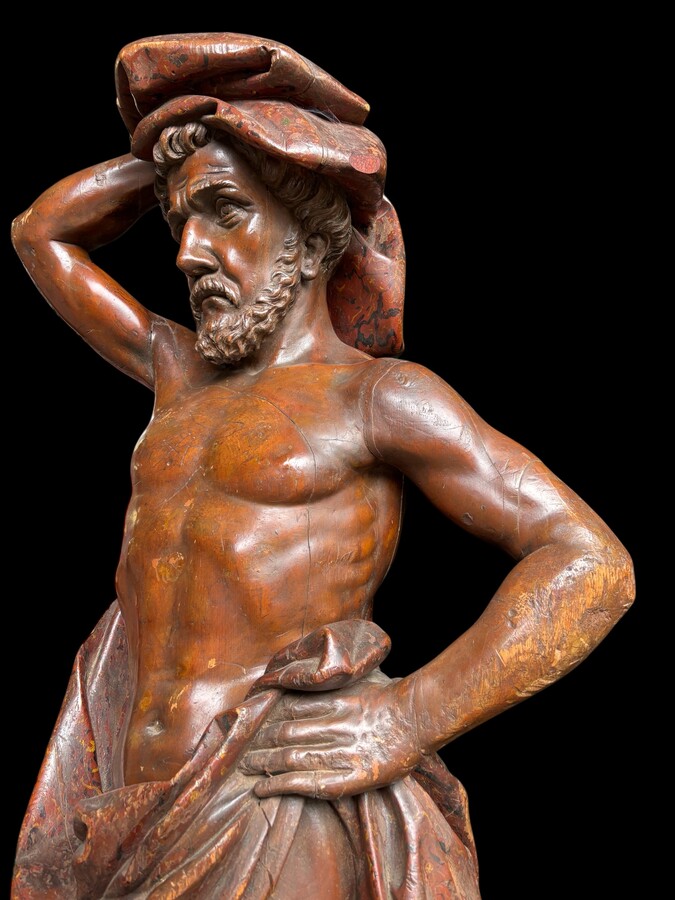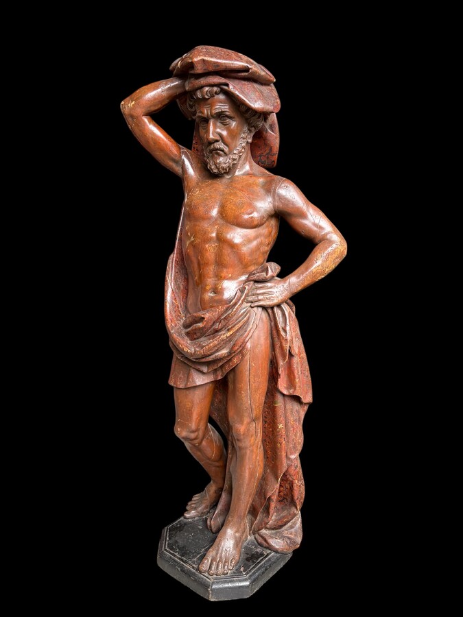 Large Italian painted wooden sculpture dating from around 1700 (157 cm). Highly decorative wooden sculpture depicting a man wrapped in cloth, which can also be used as a support. Dimensions: Height: 157 cm.