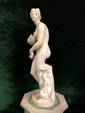 Nice alabaster sculpture from the 19th century. ( 79 cm ) Beautiful alabaster sculpture finely detailed representing Venus with a fish and 2 angels playing. Signed on the base at the back Dimensions : Height : 79 cm Width : 26 cm Foot diameter : 21 cm