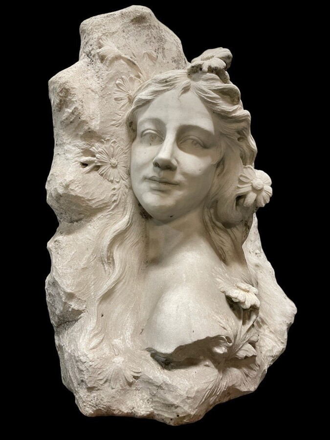 White Marble Art Nouveau Relief Of A Young Woman Beautiful Sculpture Depicting A Young Woman With Flowers Dimensions : Height : 46 Cm Width : 37 Cm Depth : 22 Cm Sculpture In Good Condition , About 1900