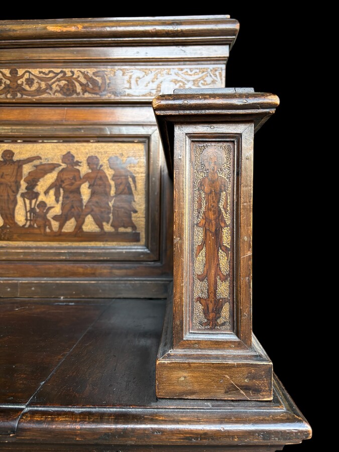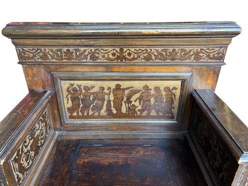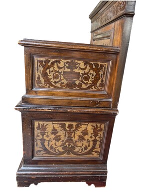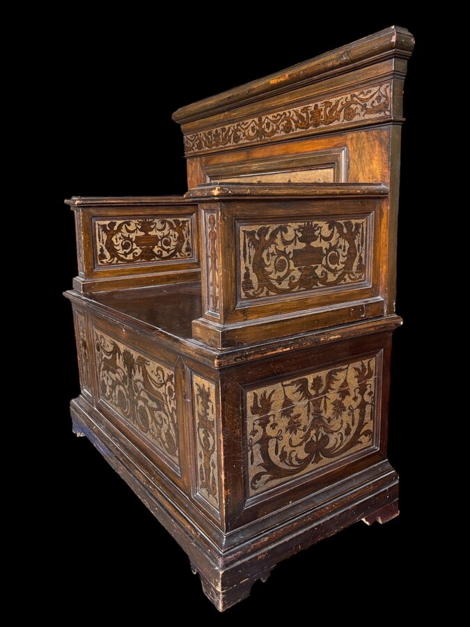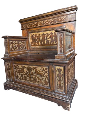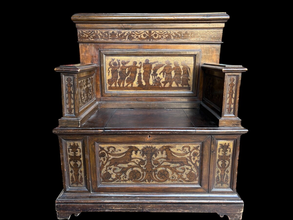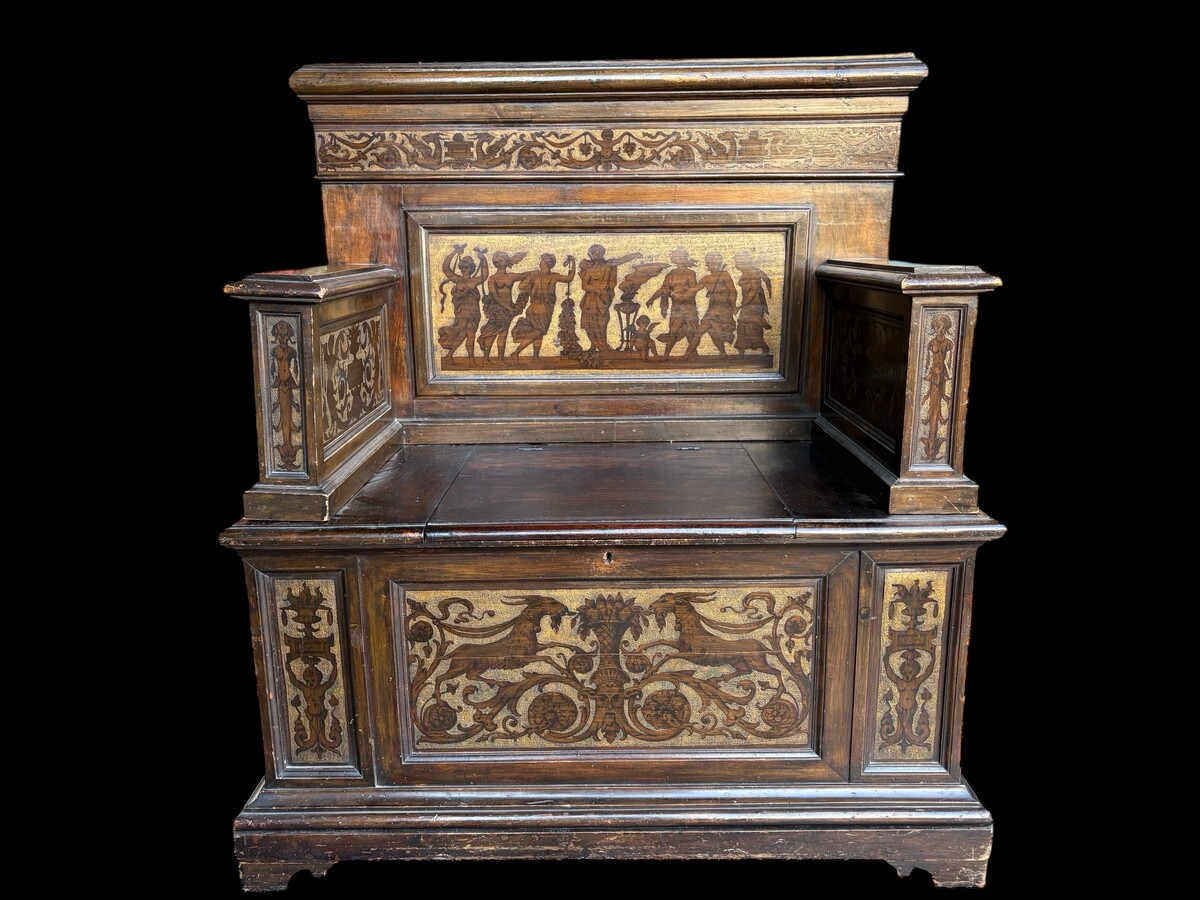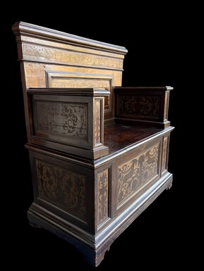 19th-century Italian walnut entrance bench Elegant Renaissance-style entrance bench, finely carved with representations of animals and mythological figures. The bench consists of two parts, is equipped with a flap and is in good condition.