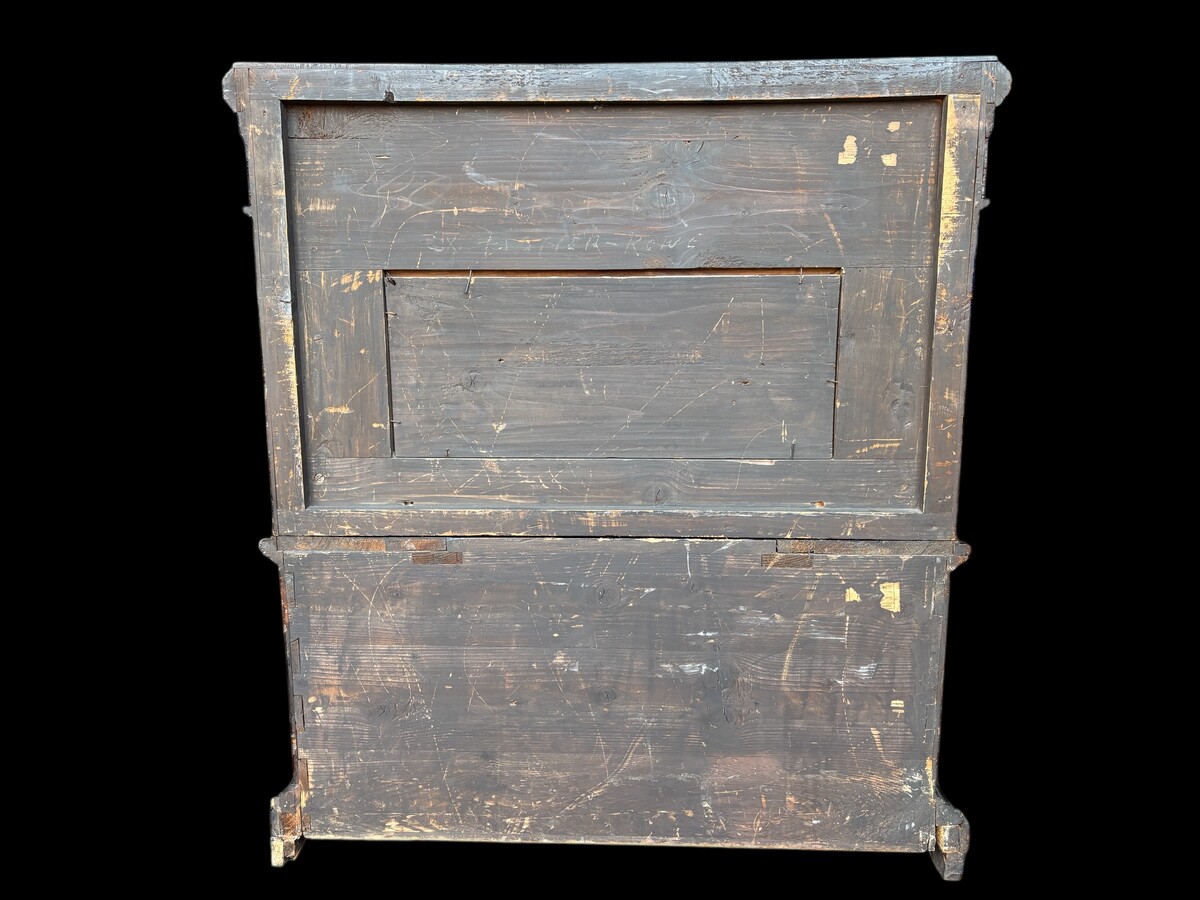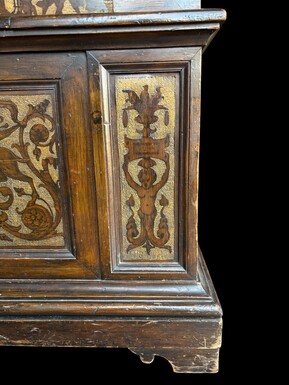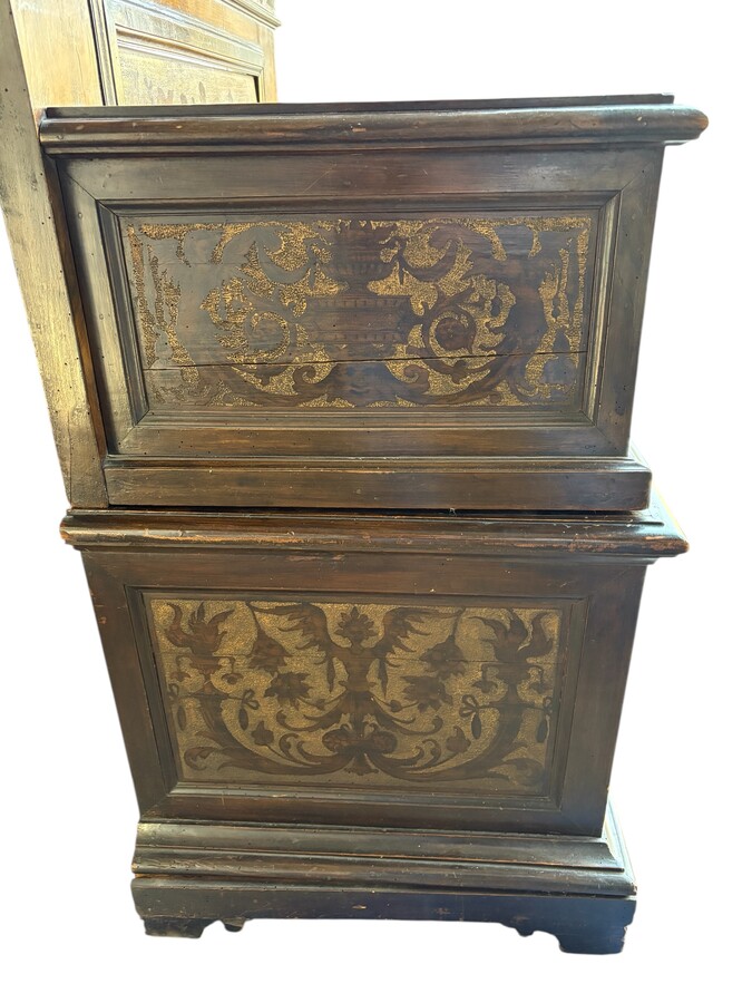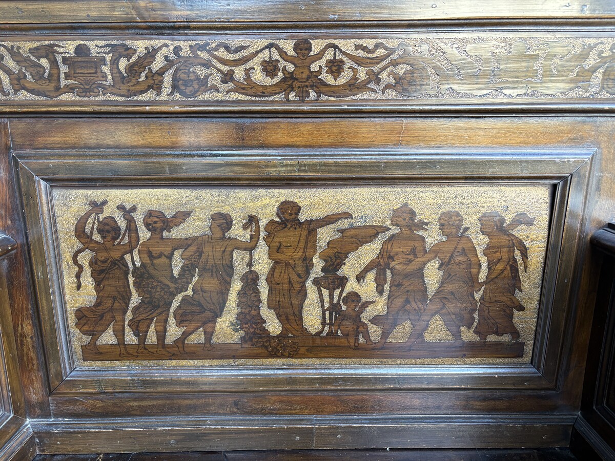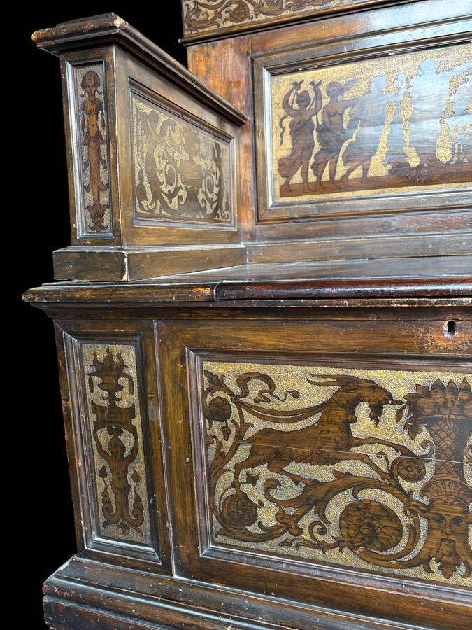 19th-century Italian walnut entrance bench Elegant Renaissance-style entrance bench, finely carved with representations of animals and mythological figures. The bench consists of two parts, is equipped with a flap and is in good condition.