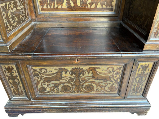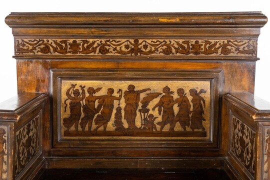 19th-century Italian walnut entrance bench Elegant Renaissance-style entrance bench, finely carved with representations of animals and mythological figures. The bench consists of two parts, is equipped with a flap and is in good condition.