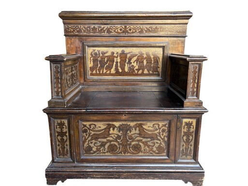 19th-century Italian walnut entrance bench Elegant Renaissance-style entrance bench, finely carved with representations of animals and mythological figures. The bench consists of two parts, is equipped with a flap and is in good condition.