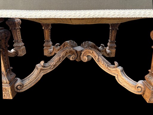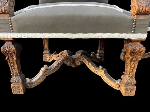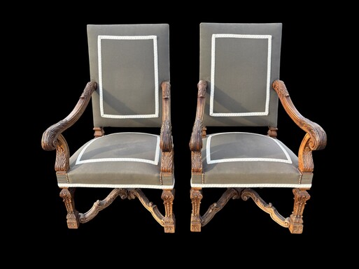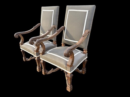 A pair of large 19th-century Regency-style oak armchairs. Decorative oak armchairs, upholstered in taupe fabric with a lace ribbon border. Dimensions: Height: 121 cm Width: 67 cm Depth: 70 cm