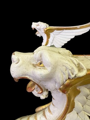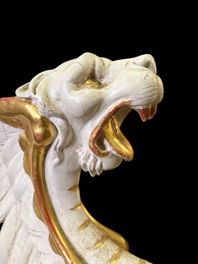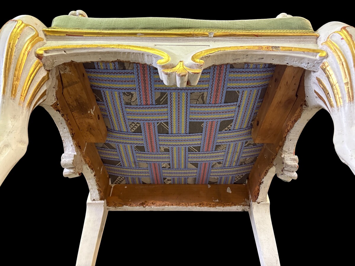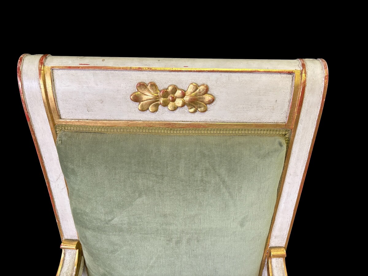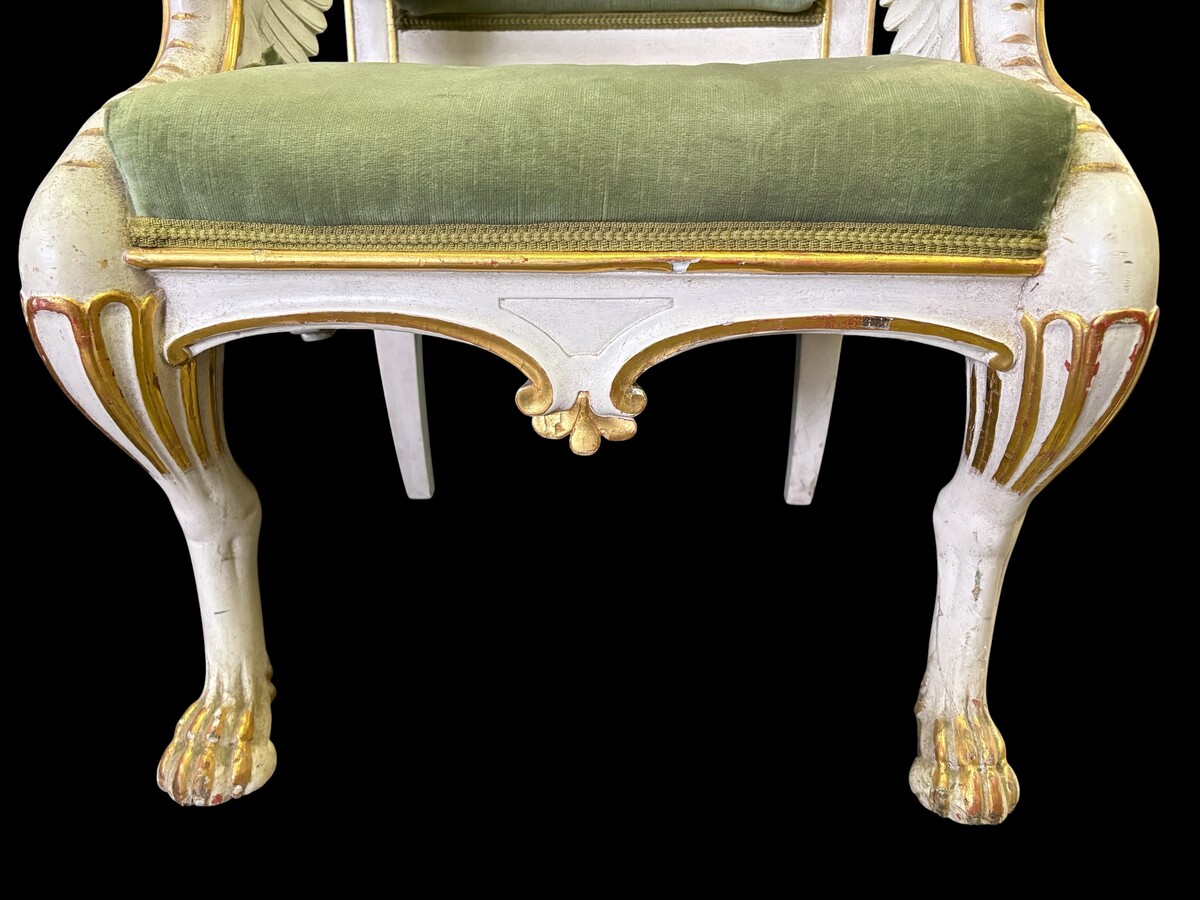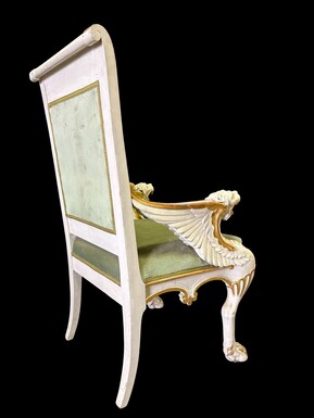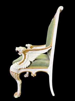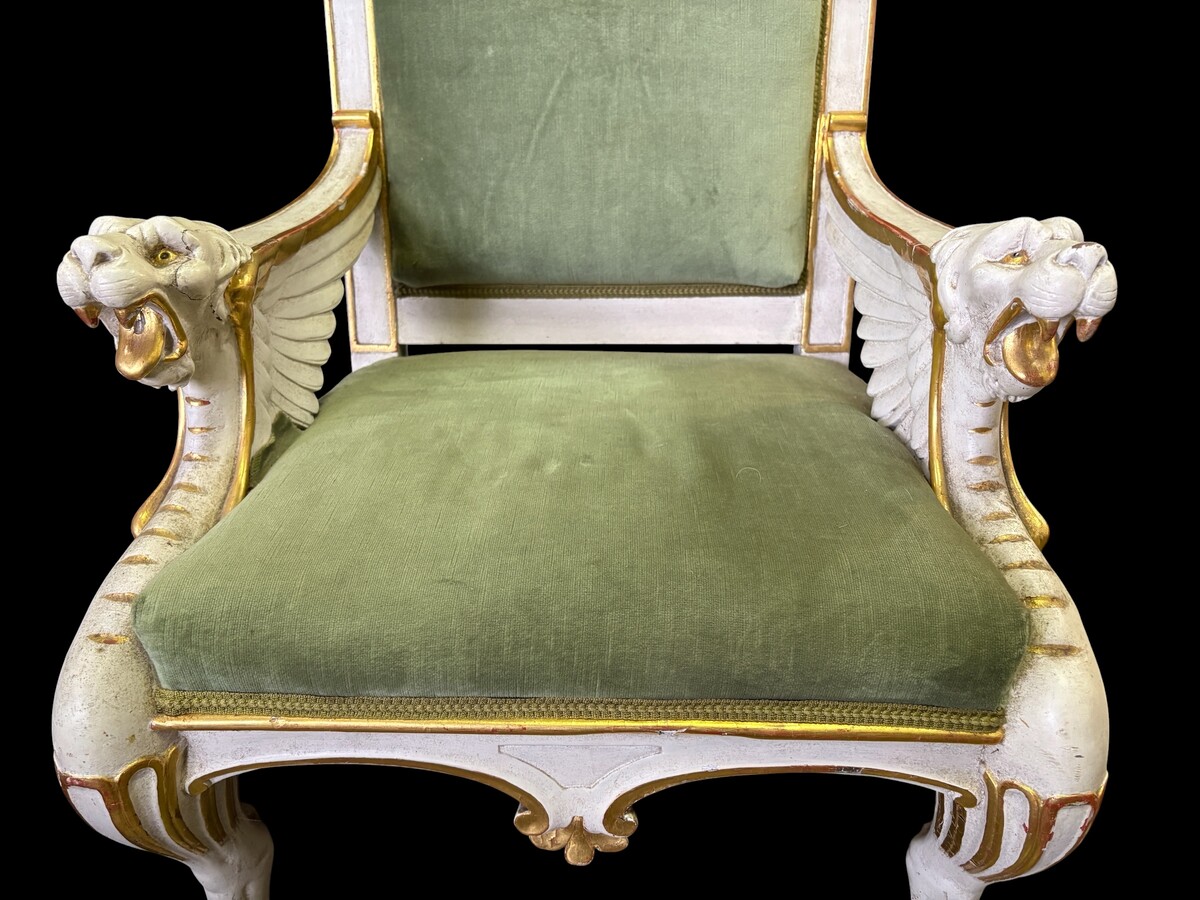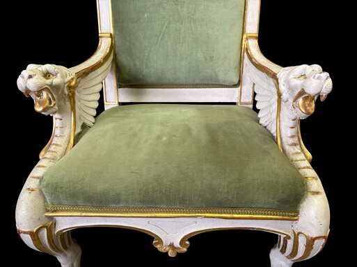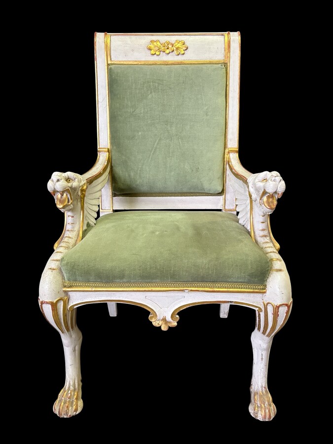 Empire-style armchair featuring ‘mythological winged creatures’, 19thC. A decorative armchair adorned with mythological winged creatures, finished in a white patina with gold accents and upholstered in green fabric.