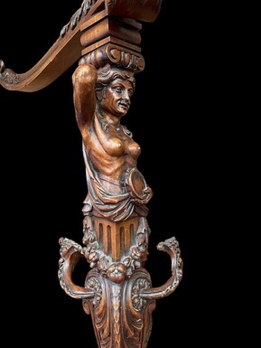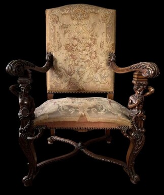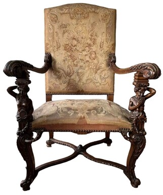 Large armchair "2 sculptures" in walnut with gebelain fabric 19th century. Beautiful large armchair decorated with sculptures of a mythological woman and man with musical instruments and girlandes. Armchair and goblin in good condition.
