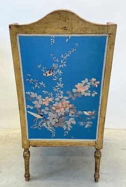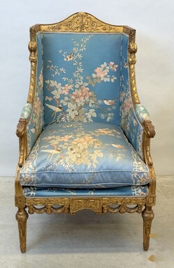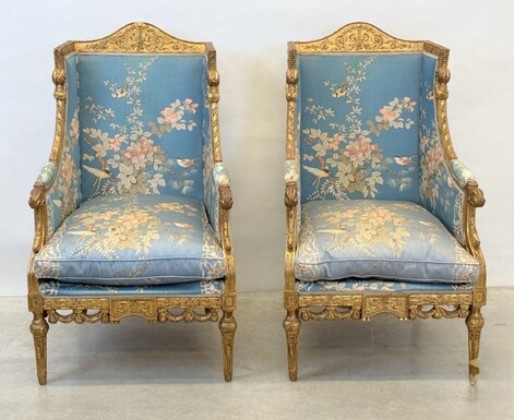 Pair of giltwood bergères in the Louis Seize style 1900 Decorative bergères adorned with garlands and carved ornaments and upholstered in a beautiful blue fabric with bird and flower motifs. The seat of one of the armchairs needs restoring!