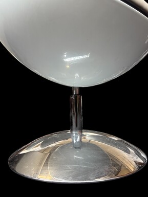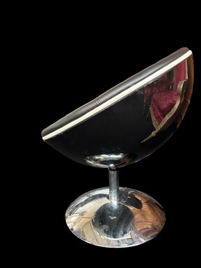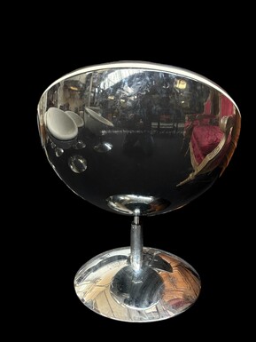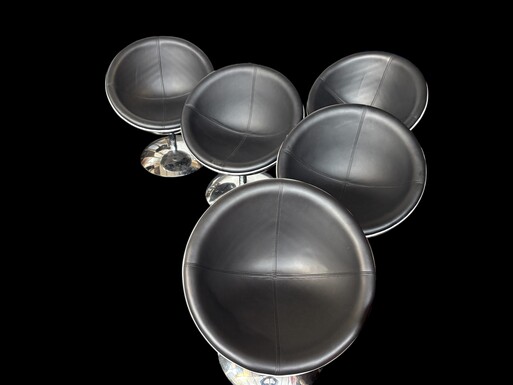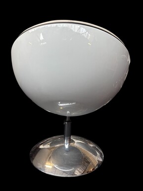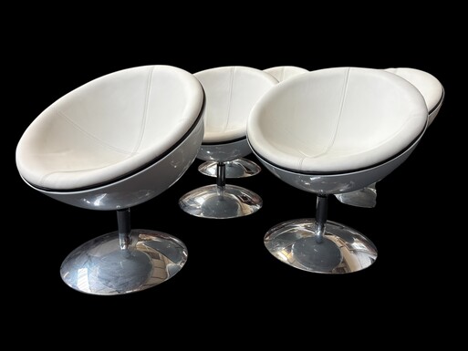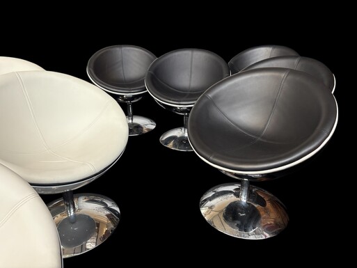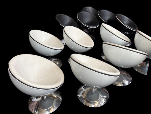 Set of 12 designer chairs in a half-egg shape with coloured polyester frame, chrome metal swivel base and white and black sky upholstery. Late 20th century reproductions based on a model from the 1960s-1970s. In good condition with signs of wear.