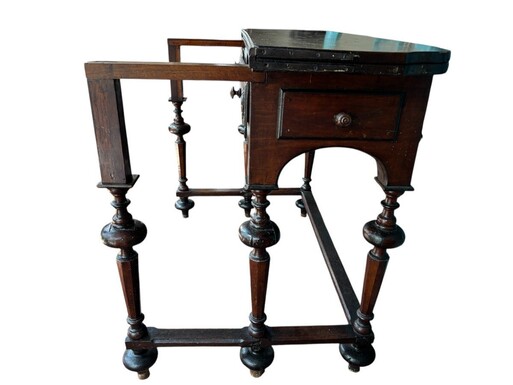 17th century walnut folding table. Elegant Louis XIV walnut and oak folding/writing table with folding system, 3 small drawers and folding top. Beautiful table in used condition with some minor defects.