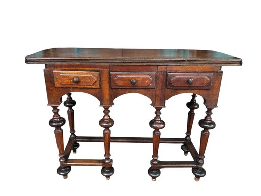 17th century walnut folding table. Elegant Louis XIV walnut and oak folding/writing table with folding system, 3 small drawers and folding top. Beautiful table in used condition with some minor defects.