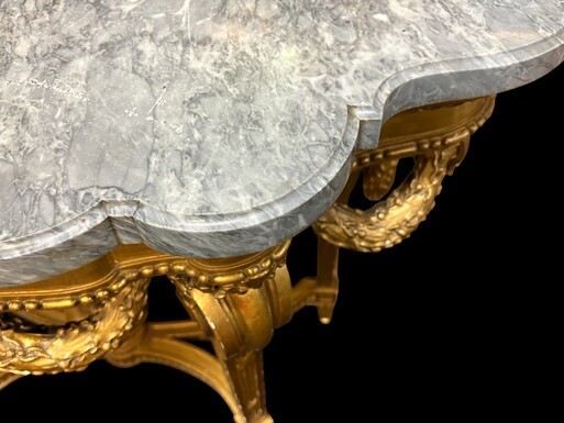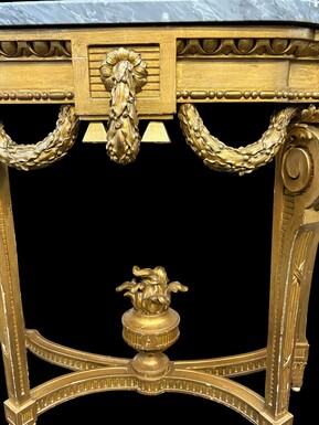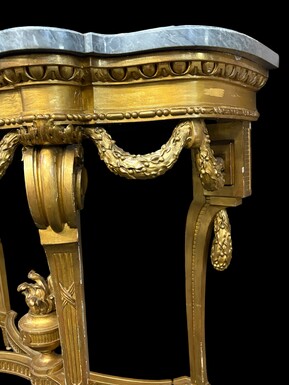 19th-century Louis XVI-style console table in gilded wood. The console features four legs decorated with garlands and a large vase at the base, topped with a superb 3 cm thick grey marble top. The console and marble top are in good condition, w