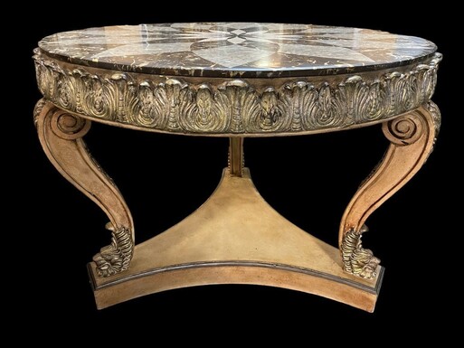 Decorative centre table with inlaid marble top 20th century. Nice 3-leg table decorated with ornaments, shells and animals with a top in marble mosaic on top. Dimensions : Height : 83 cm. Diameter : 112 ( top ) , 115 cm table edge