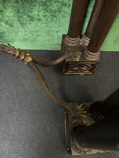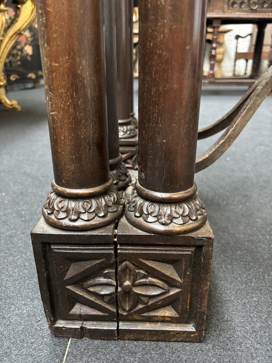Decorative console/wall table in walnut 19thC. Special console with eagle sculptures in front and on both sides and fitted with 3 columns per leg. The 4 legs are connected with a wrought-iron decoration , the top is in marble Dimensions : Width : 131 cm H
