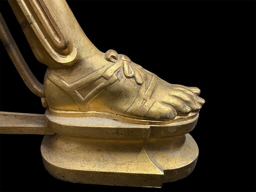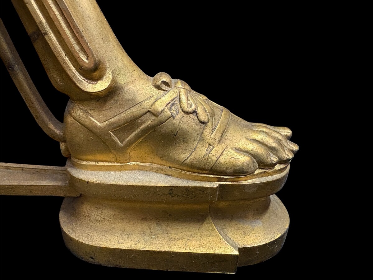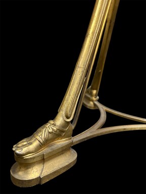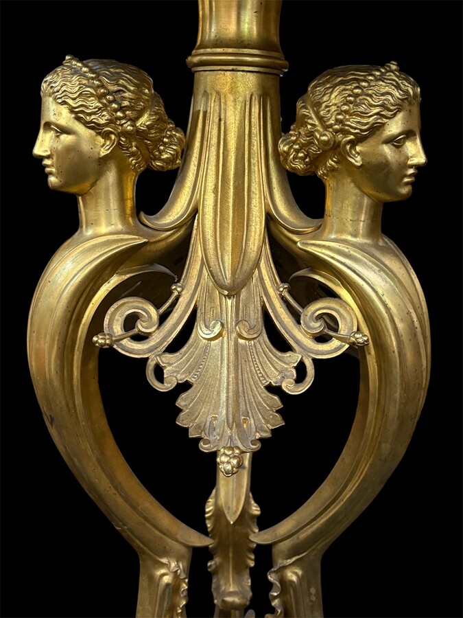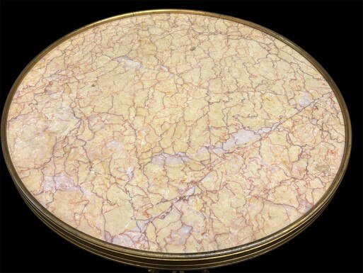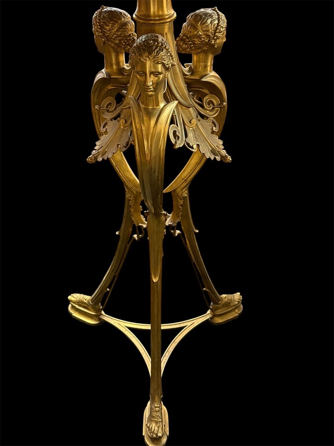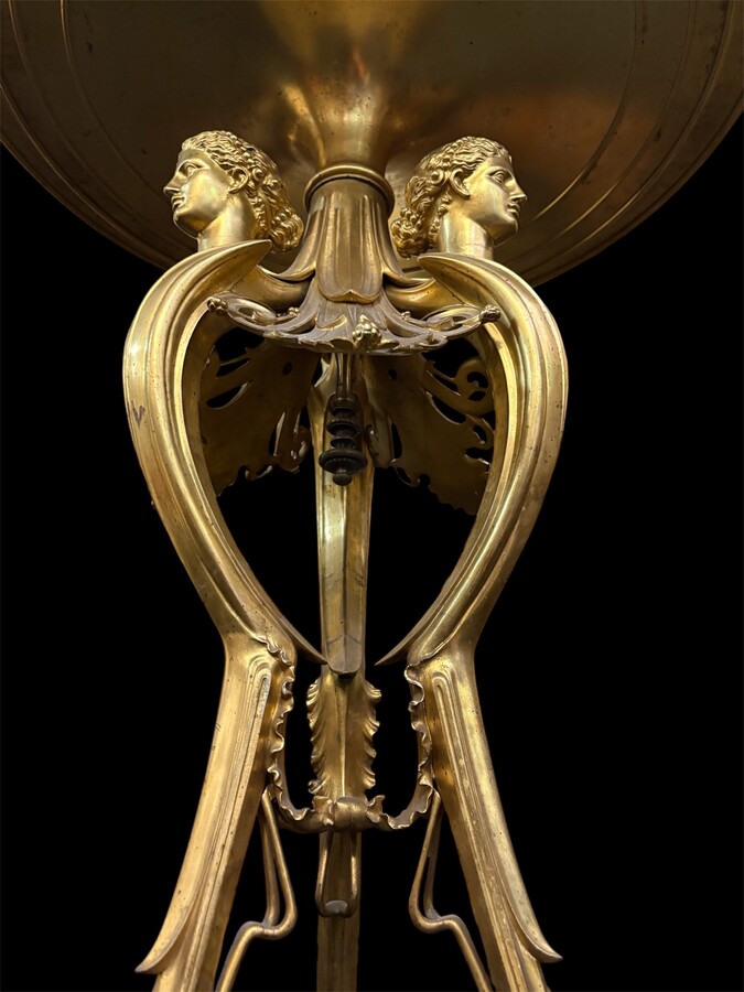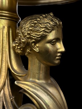 Gilded bronze pedestal table signed F. Barbedienne, 19th century. A rare, high-quality pedestal table decorated with three female figures on a base and featuring a coloured marble top. The table is signed by F. Barbedienne on the base.