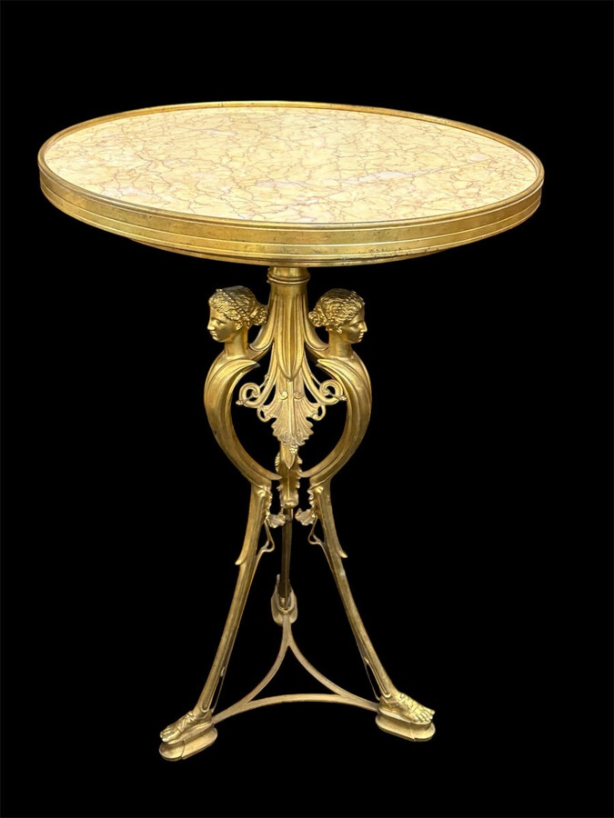 Gilded bronze pedestal table signed F. Barbedienne, 19th century. A rare, high-quality pedestal table decorated with three female figures on a base and featuring a coloured marble top. The table is signed by F. Barbedienne on the base.