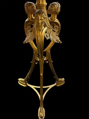 Gilded bronze pedestal table signed F. Barbedienne, 19th century. A rare, high-quality pedestal table decorated with three female figures on a base and featuring a coloured marble top. The table is signed by F. Barbedienne on the base.