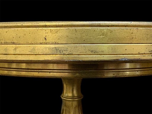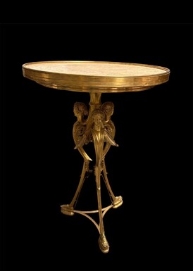 Gilded bronze pedestal table signed F. Barbedienne, 19th century. A rare, high-quality pedestal table decorated with three female figures on a base and featuring a coloured marble top. The table is signed by F. Barbedienne on the base.