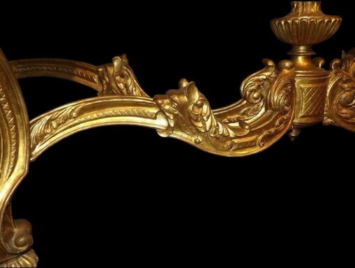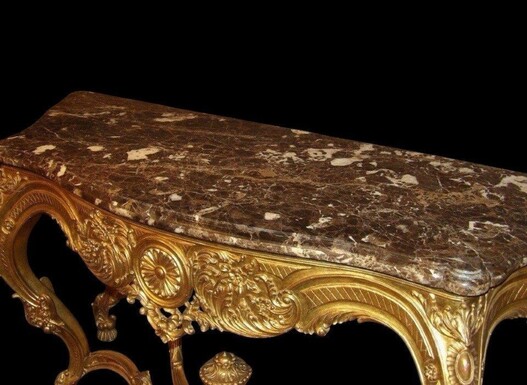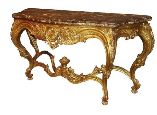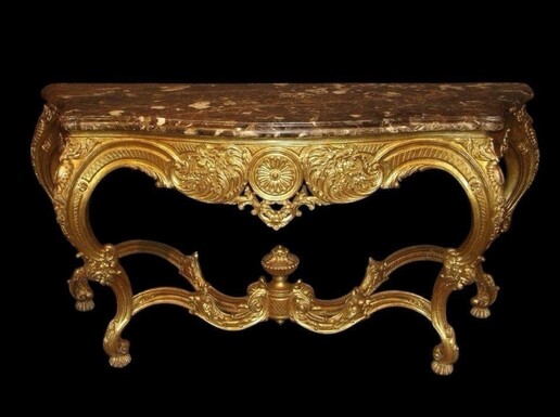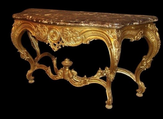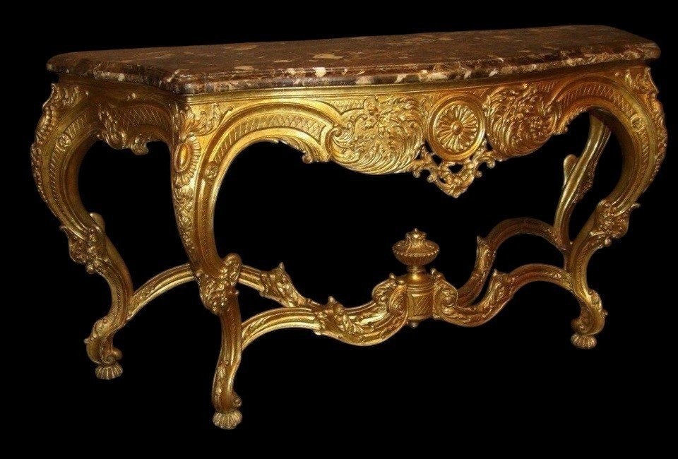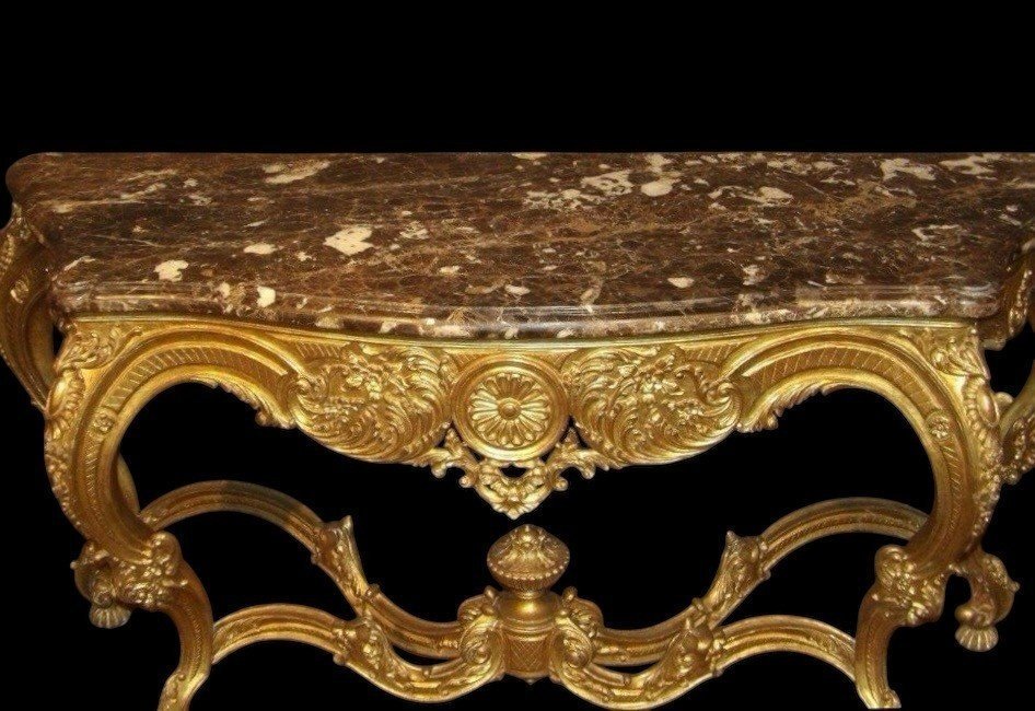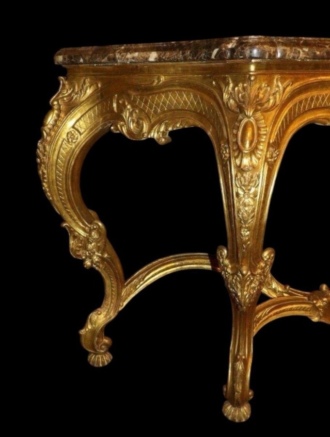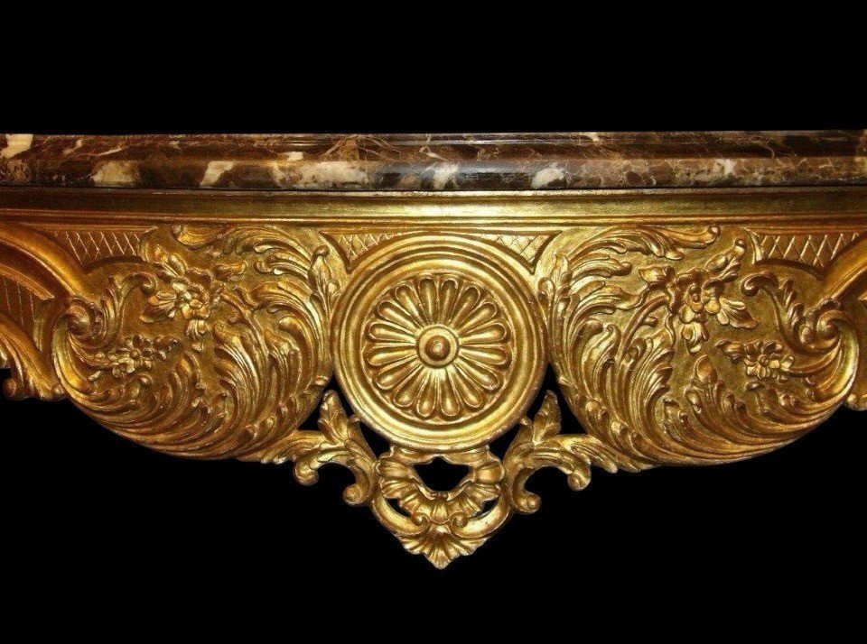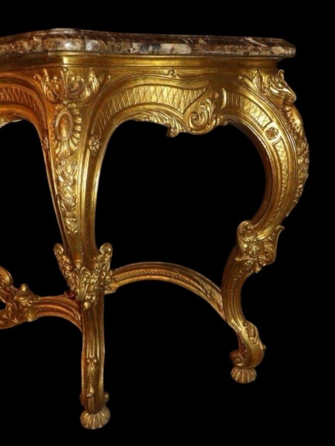 Large 4-foot console Louis XV style in gilded wood 19th century Beautiful large console with original gilding and 4 cm thick marble top. Marble in very good condition , base in wood has some old restorations on the legs. Dimensions : Width : 191 cm