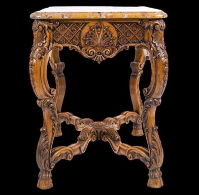 Ornately carved wooden coffee table with a marble top, circa 1920. Attractive oak coffee table/console with a Breche d'Aleppo marble top. Dimensions: Height: 80 cm. Width: 100 cm. Depth: 60 cm. In very good condition.