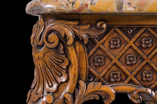 Ornately carved wooden coffee table with a marble top, circa 1920. Attractive oak coffee table/console with a Breche d'Aleppo marble top. Dimensions: Height: 80 cm. Width: 100 cm. Depth: 60 cm. In very good condition.