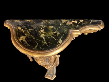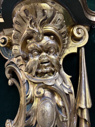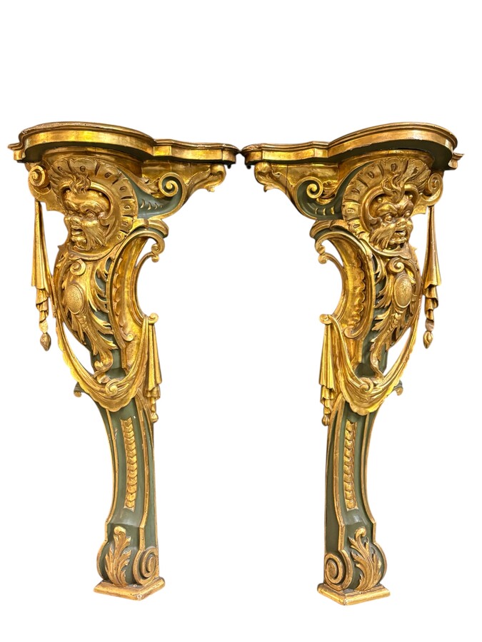 Pair of large, elegant 18th-century Italian wall consoles. Highly decorative consoles in gilded and patinated wood, adorned with a mythological head and decorated with drapery, scrolls and ornaments. The top shelf is painted in faux marble.