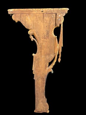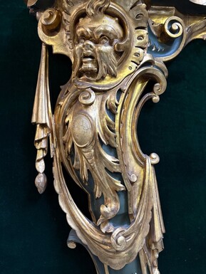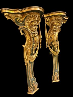Pair of large, elegant 18th-century Italian wall consoles. Highly decorative consoles in gilded and patinated wood, adorned with a mythological head and decorated with drapery, volutes and ornaments. The top shelf is painted in faux marble.