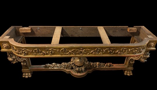 Very large Louis XVI style console table (230 cm) in gilded wood from the 19th century. High-quality console table entirely carved in wood, decorated with gilded motifs, floral scrolls, a large decorative vase in its lower section.