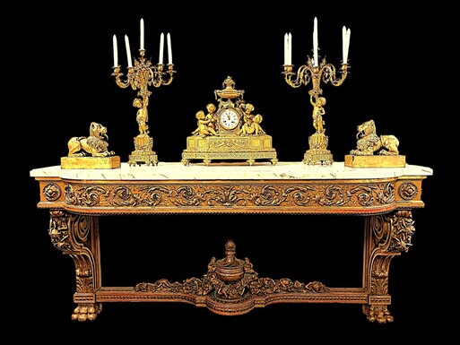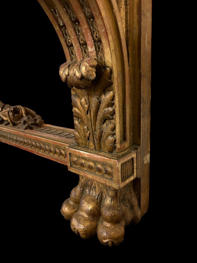 Very large Louis XVI style console table (230 cm) in gilded wood from the 19th century. High-quality console table entirely carved in wood, decorated with gilded motifs, floral scrolls, a large decorative vase in its lower section.