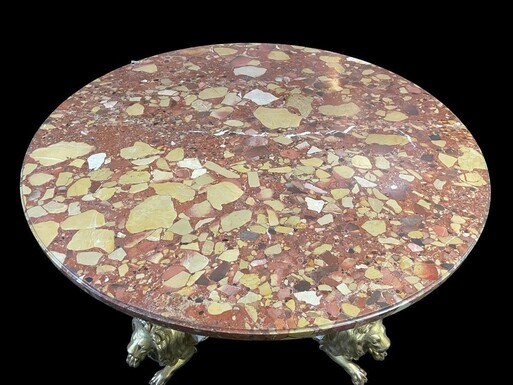 White and Gold Carved Wooden Table With Round Top In Breche d'Alep Marble. A white and gold carved wooden centre table with a round Breche d'Alep marble top resting on a central quadrangular shaft underlined by four inverted consoles and panels.