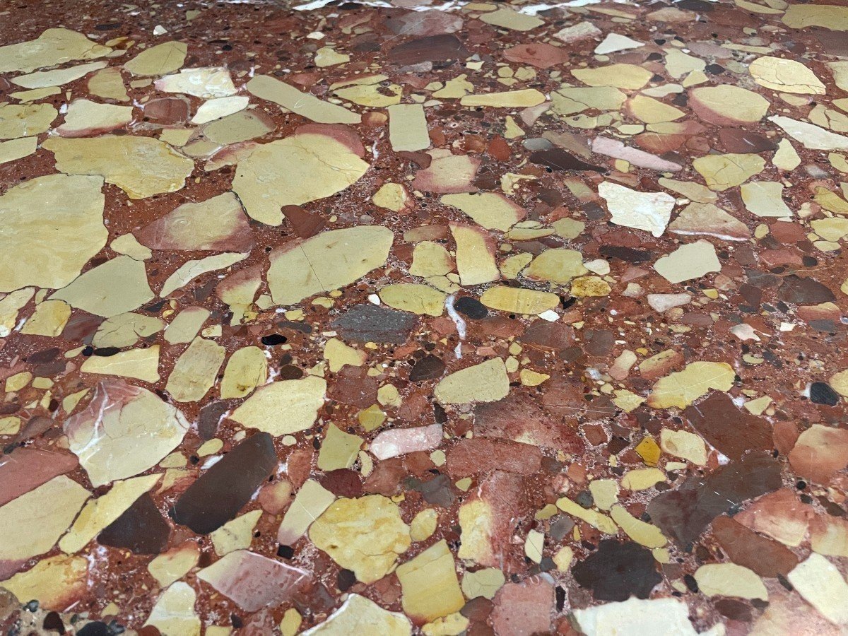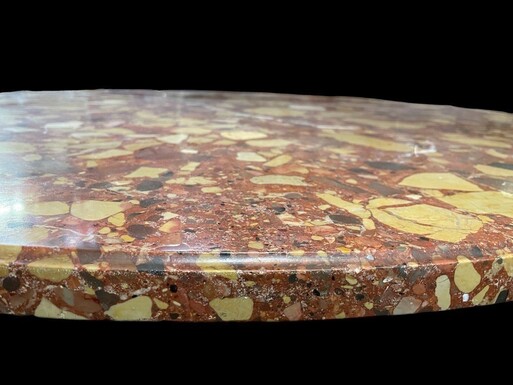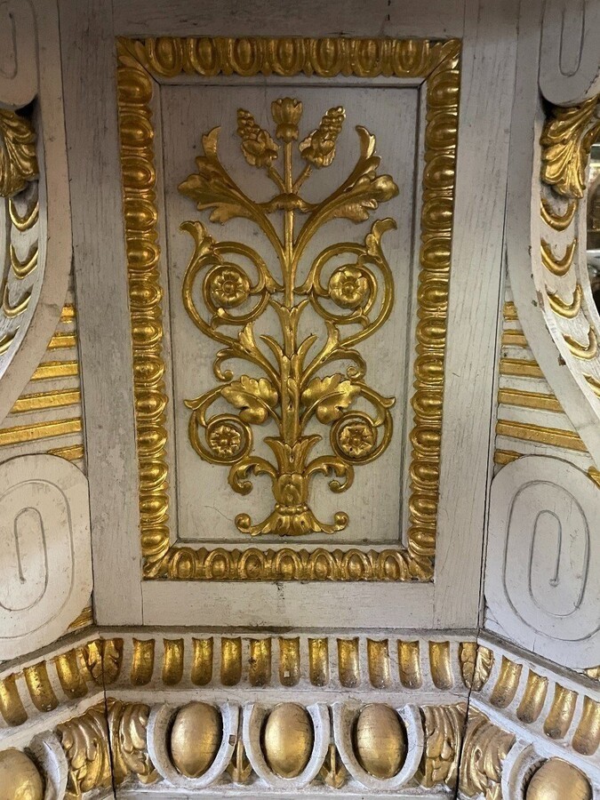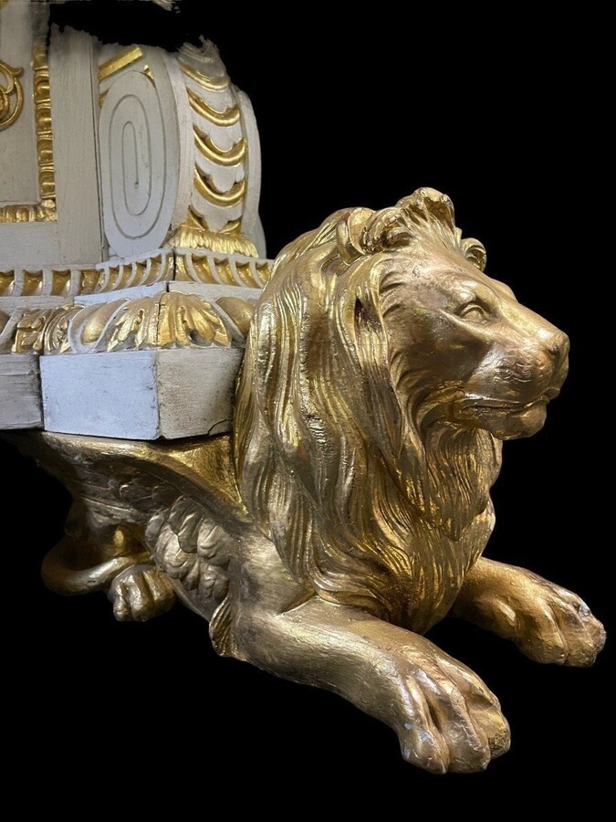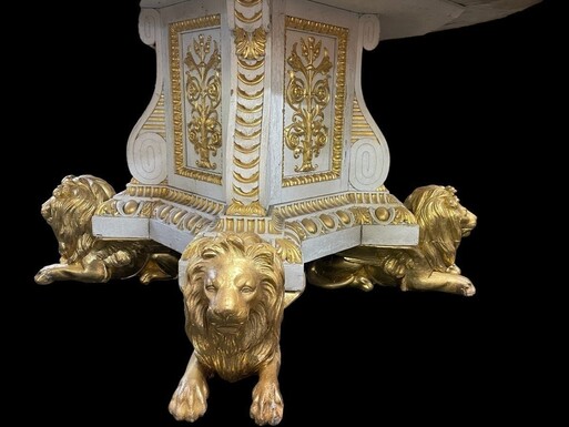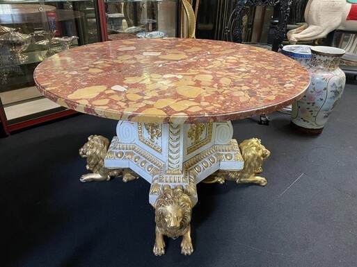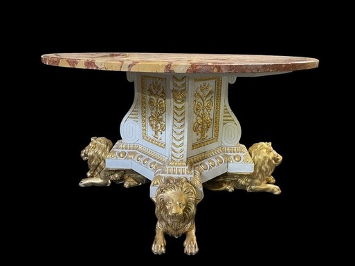 White and Gold Carved Wooden Table With Round Top In Breche d'Alep Marble. A white and gold carved wooden centre table with a round Breche d'Alep marble top resting on a central quadrangular shaft underlined by four inverted consoles and panels.